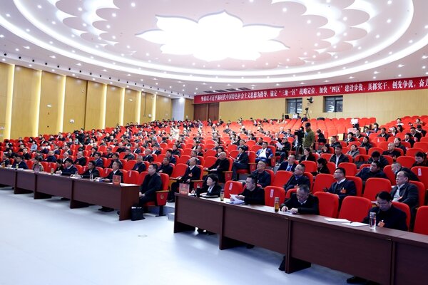 会场庄重简朴、气氛热烈,悬挂的“坚持以习近平新时代中国特色社会主义思想为指导,锚定‘三地一区’战略定位、加快‘四区’建设步伐,真抓实干、创先争优,奋力谱写现代化颍泉篇章!”的标语,鼓舞人心,催人奋进。